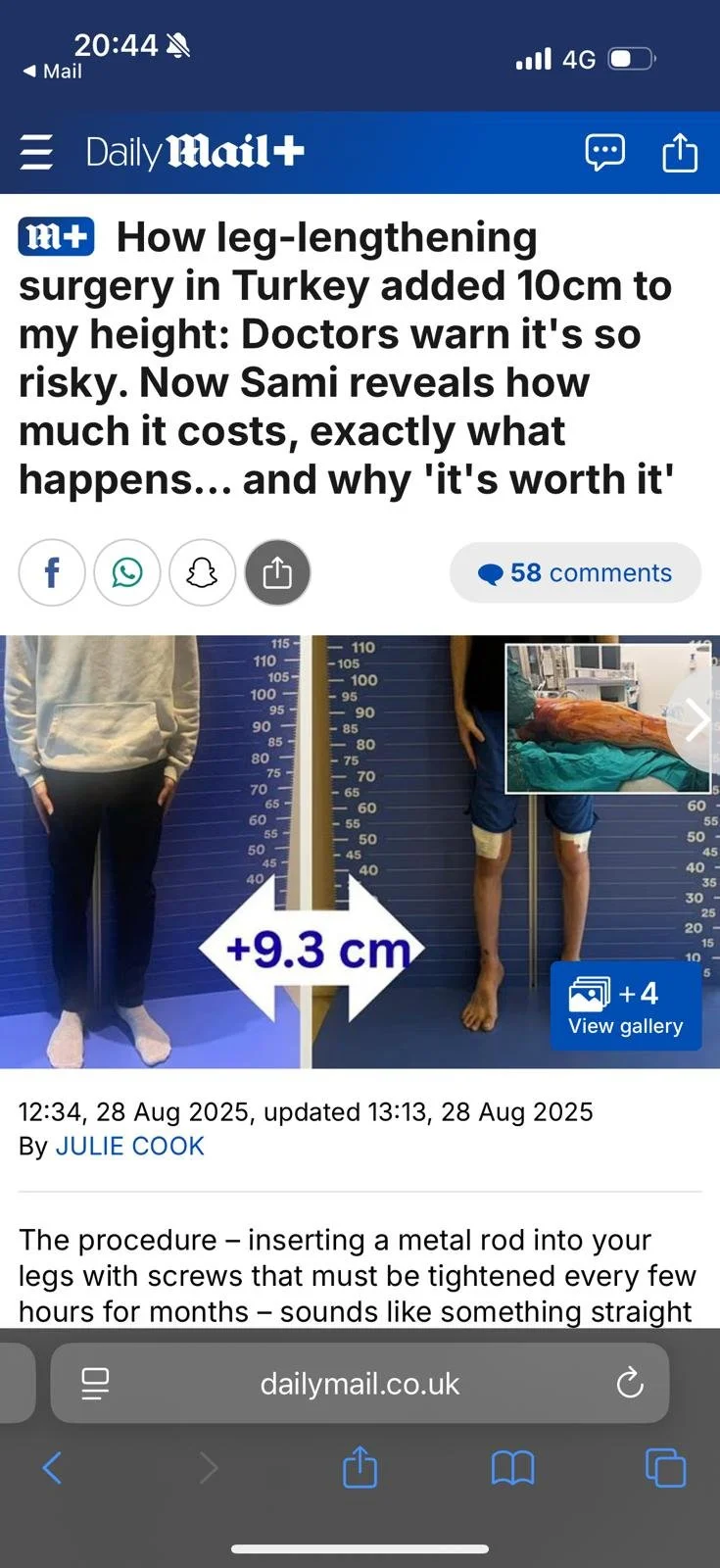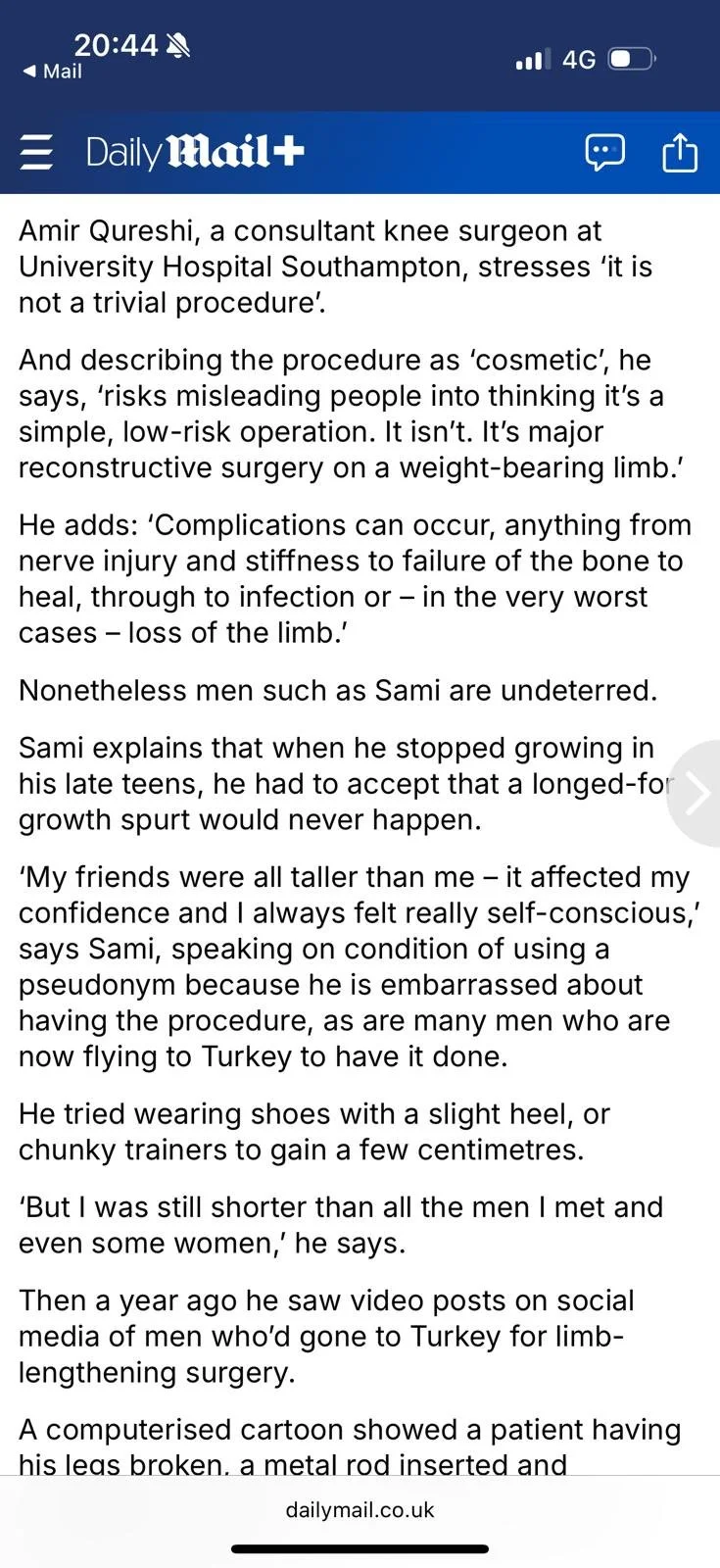 Amir Qureshi August 29, 2025 How leg-lengthening surgery in Turkey added 10cm to my height: Doctors warn it's so risky. Now Sami reveals how much it costs, exactly what happens... and why 'it's worth it' Amir Qureshi August 29, 2025 Pleased to share this article on leg lengthening. Many thanks to Julie Cook for this article.How leg-lengthening surgery in Turkey added 10cm to my height: Doctors warn it's so risky. Now Sami reveals how much it costs, exactly what happens... and why 'it's worth it' | Daily Mail Online